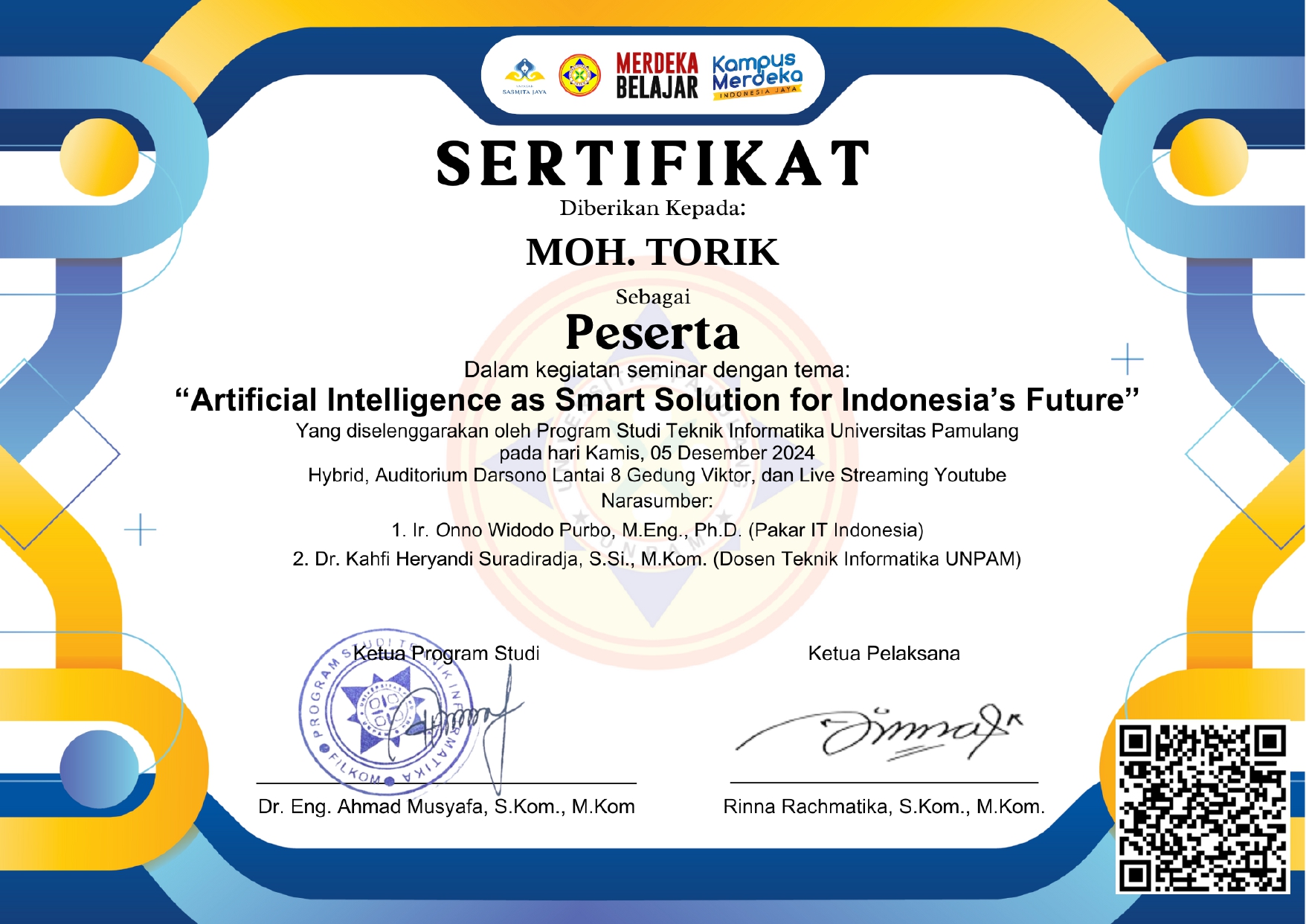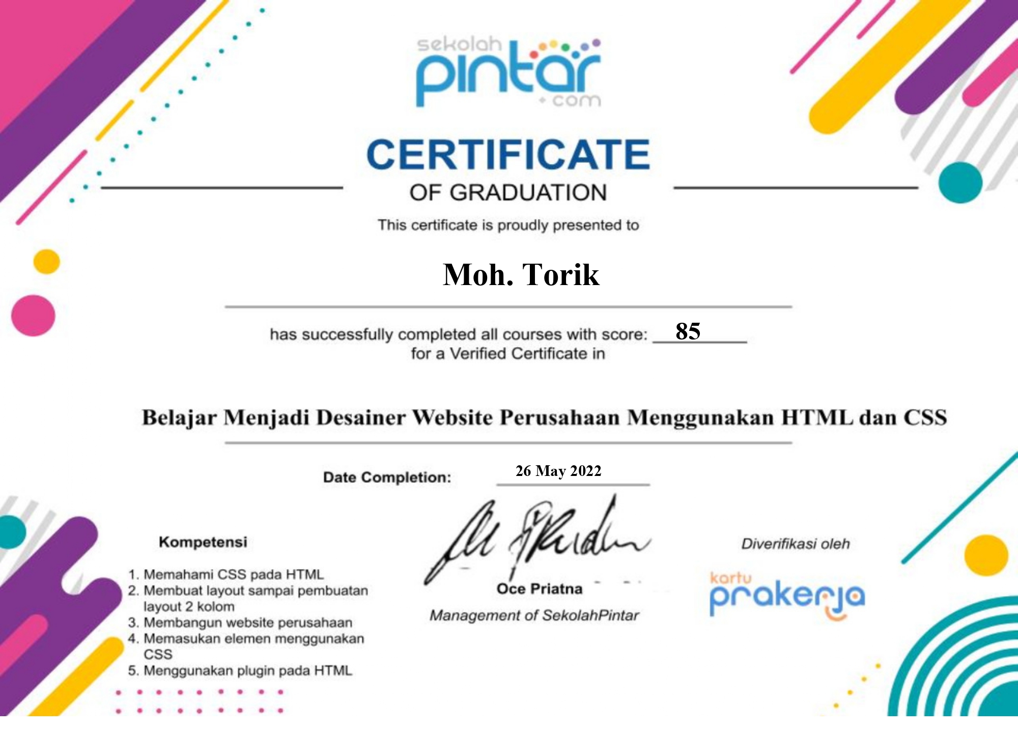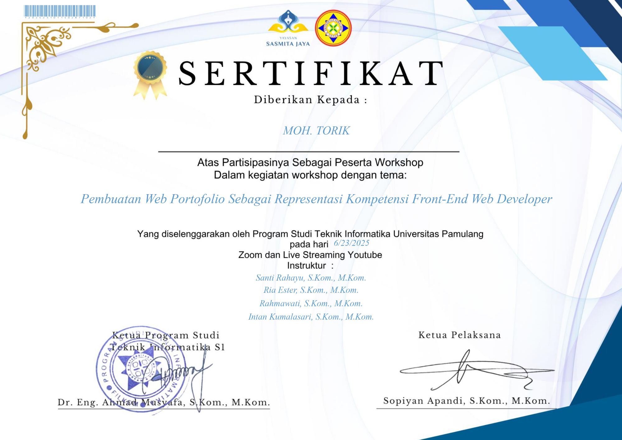 Selamat datang di website Portfolio saya. Perkenalkan nama saya Moh.Torik, Saya adalah Mahasiswa Universitas Pamulang Angkatan 2023/2024 Jurusan Teknik Informatika kelas regular Sabtu, saya mengambil jurusan Teknik Informatika karena saya punya keinginan besar menjadi seorang pengembang aplikasi atau software, Saya sangat menyukai sebuah perkembangan teknologi yang setiap waktu terus berkembang pesat dan terus mengikuti perkembangan zaman, itu sebab nya saya mengambil jurusan ini karena saya ingin sekali menjadi bagian dari pengembang ini, saya rasa di era teknologi yang terus berkembang saat ini rasanya tidak puas jika saya hanya menjadi penonton dan hanya sebatas pengguna saja tanpa menjadi bagian di dalamnya. Saya telah mempelajari beberapa Bahasa Pemrograman dan dasar-dasar pembuatan Website diantaranya : UI/UX Design, HTML, CSS, JavaScript, PHP, C++, Java, Database MySQL, GitHub, VPS Server, Linux Server, Jaringan Komputer dan beberapa skill pendukung lainnya seperti Adobe Photoshop, Adobe Ilustrator, Figma, MS. Excel, Word, PPT, dll. Saya akan terus mengeksplorasi diri saya untuk terus berkembang dan terus memperdalam ilmu pemrograman saya untuk menyesuaikan kebutuhan Industri saat ini, untuk terus maju dan dapat berkreasi dengan menghasilkan karya-karya yang bisa saya buat dengan kreatifitas tanpa batas.