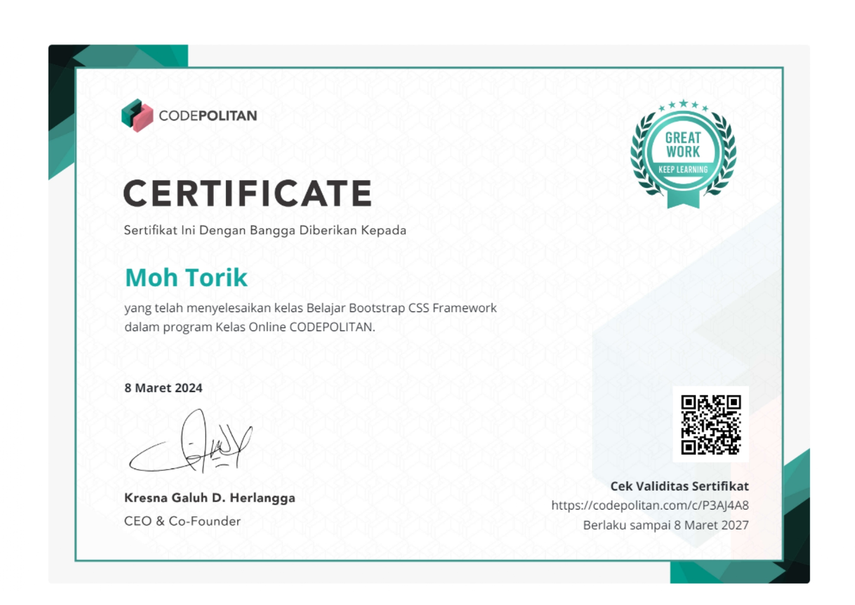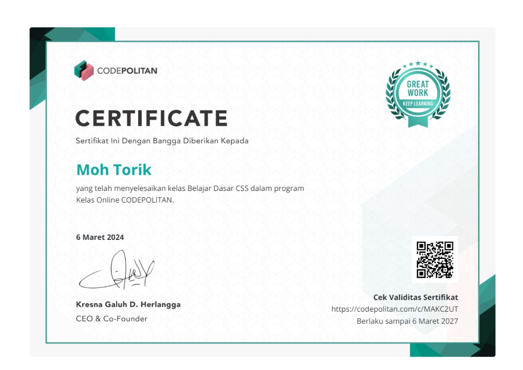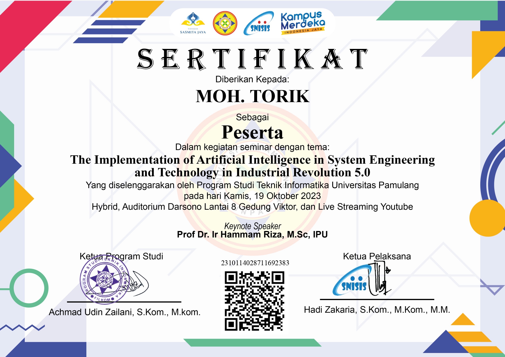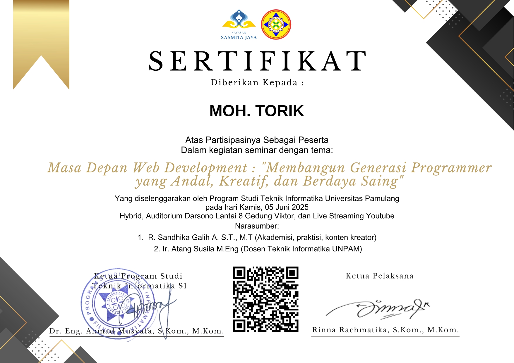 Selamat datang di website Portfolio saya. Perkenalkan nama saya Moh.Torik, Saya adalah Mahasiswa Universitas Pamulang Angkatan 2023/2024 Jurusan Teknik Informatika kelas regular Sabtu, saya mengambil jurusan Teknik Informatika karena saya punya keinginan besar menjadi seorang pengembang aplikasi atau software, Saya sangat menyukai sebuah perkembangan teknologi yang setiap waktu terus berkembang pesat dan terus mengikuti perkembangan zaman, itu sebab nya saya mengambil jurusan ini karena saya ingin sekali menjadi bagian dari pengembang ini, saya rasa di era teknologi yang terus berkembang saat ini rasanya tidak puas jika saya hanya menjadi penonton dan hanya sebatas pengguna saja tanpa menjadi bagian di dalamnya. Saya telah mempelajari beberapa Bahasa Pemrograman dan dasar-dasar pembuatan Website diantaranya : UI/UX Design, HTML, CSS, JavaScript, PHP, C++, Java, Database MySQL, GitHub, VPS Server, Linux Server, Jaringan Komputer dan beberapa skill pendukung lainnya seperti Adobe Photoshop, Adobe Ilustrator, Figma, MS. Excel, Word, PPT, dll. Saya akan terus mengeksplorasi diri saya untuk terus berkembang dan terus memperdalam ilmu pemrograman saya untuk menyesuaikan kebutuhan Industri saat ini, untuk terus maju dan dapat berkreasi dengan menghasilkan karya-karya yang bisa saya buat dengan kreatifitas tanpa batas.